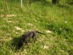 jučer i danas smo bili na roštilju na jednoj vikendici i malac je uživao! prvo je krenulo istrčavanje i ispitivanje teritorija. onda kad je sve prošao a ponešto i obilježio (btw pomalo je počeo dizat nogicu) krenulo je žicanje hrane. od krumpira, preko čipsa, ma sve što je itko krenuo u usta stavit.. kad to nije dobio okrenuo se jedinom pouzdanom - drvima.. grize grančice ko veliki! nakon nekoliko upozorenja zbog lizanja ulja koje je na kraju završilo i u njegovim ustima i na glavici i svugdje, lekciju ga je naučila jedna pćelica koja nije bila raspoložena za dijeljenje ulja.. dobio sam piku u nosić! e, da ste vidli tu dramu.. svi stali, svi ga gledaju, svi ga žale ko da ga je roj pčela izbo! a on cmolji ko curica! prvo smo mislili da je trn kad smo skužili nešto na njuškici (a ja sam dobila nezavidan zadatak ukljanjanja tog nesretnog ''trna'') al smo skužili da je pčela kad nije prestao cvilit ni nakon uklanjanja žalca i kad mu je usnica malo natekla.. a on koristi pažnju ko profesionalac.. uglavnom, nesretan slučaj je brzo zaboravljen i mogli smo nastavit sa žvakanjem drva.. kreten mali slatki..