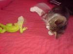 evo da se i ja pohvalim svojim malim zafrkantima. maca pero je pronadena prije mjesec ipol na podrucju sd stjepna radic (sava), imala je malo zvonce oko vrata, al kako ju niko na internetu nije trazio, odlucili smo ju zadrzati, unatoc njenim pocetnim nestaslucima kao sto su mokrenje po posteljini i vrsenje nuzde u sudoperu. danas je dobra,nuzdu obavlja u pijesku ili kad joj se da na wc skoljci. a gusu sam dobila prije 10ak dana,al je bolestan i mislim da cu ga sutra voditi na veterinarski u ambulantu na pregled, ujutro moram nazvati pa da se dogovorim jer kad sam ga dobila bio je jako slab i puno koze mu je bilo neoljusteno, pogotovo na noktima, zbog toga su mu se i posusila i otpala 4 nokta na straznjoj nozi. opcenito bio je slab i jedva se kretao, sad je malo zivnuo, jede iz ruke i uopce se ne boji. evo par slika njega i macka i njihove "velike" ljubavi.