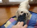 Samo da vam javim da Gizmo definitivno ostaje kod nas i mislim da on to zna. Otkad smo odlucili biti njegova "treca sreca", on se skroz raspametio. Valjda osjeca da nema vise nikakvih "mozda". Vrlo vazno raznosi po stanu svoju lopticu i ovcicu, redovito mi krade labello, rezi i "grize" kad se igramo, spava u krevetu izvrnut na ledja. Tocno vidim da nema vise nikakvih kocnica. A onaj prvi dan je stalno zmirkao i zijevao, siroce malo (pa sam ja tjerala cijelu obitelj da mu uzvraca zmirkanjem :)))